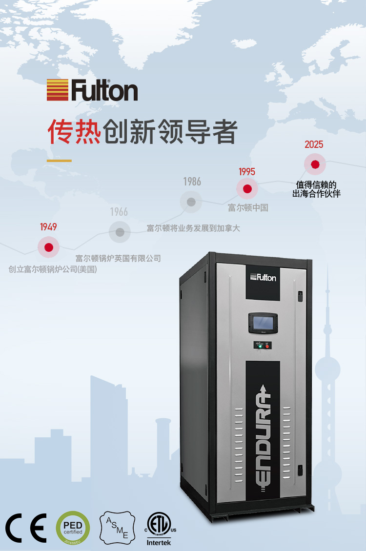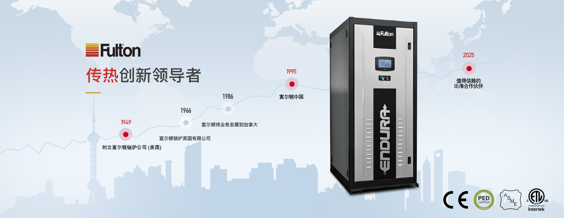 富爾頓是國際著名的跨國高質(zhì)量傳熱產(chǎn)品制造商,具有七十多年的專業(yè)設(shè)計、制造、銷售鍋爐的經(jīng)驗,是立式無管鍋爐和脈沖燃燒鍋爐的發(fā)明者,幾十年來一直領(lǐng)導世界鍋爐新潮流。